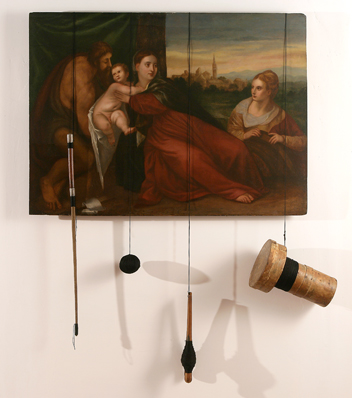 Lo Spazio Terzo: The Holy Family 2001, 50 x 32 inches ca. - 127 x 80 cm ca. XVI Cent. Oil on wood, Venetian School, thread, objects Prov.: Studio of the Artist, Venice, Italy - Museo Correr, Venice, Italy Collection of the Artist, Venice, Italy photo Mark E. Smith, Venice, Italy
