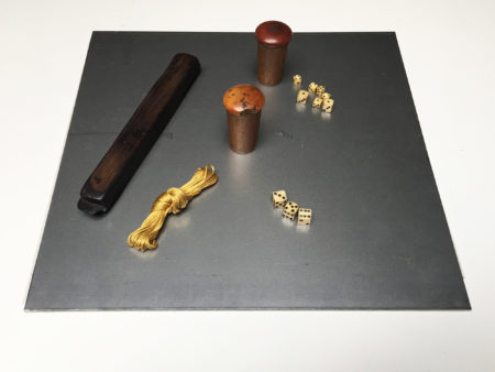 Ivory and bone dice, wood, cotton thread on steel plate