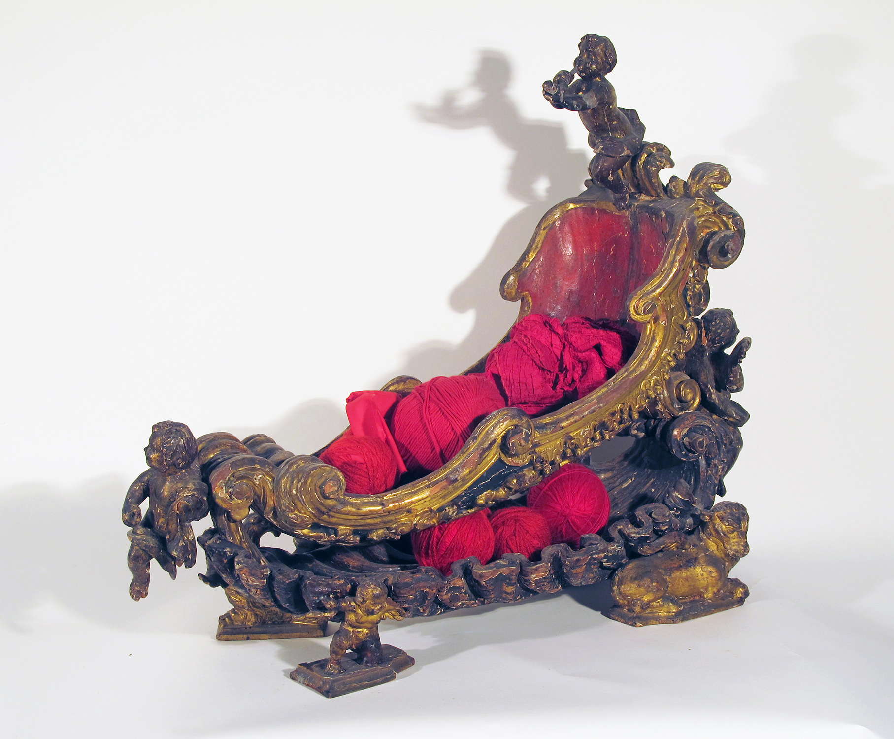 17th century gilded and painted wood cradle, fabric and cotton