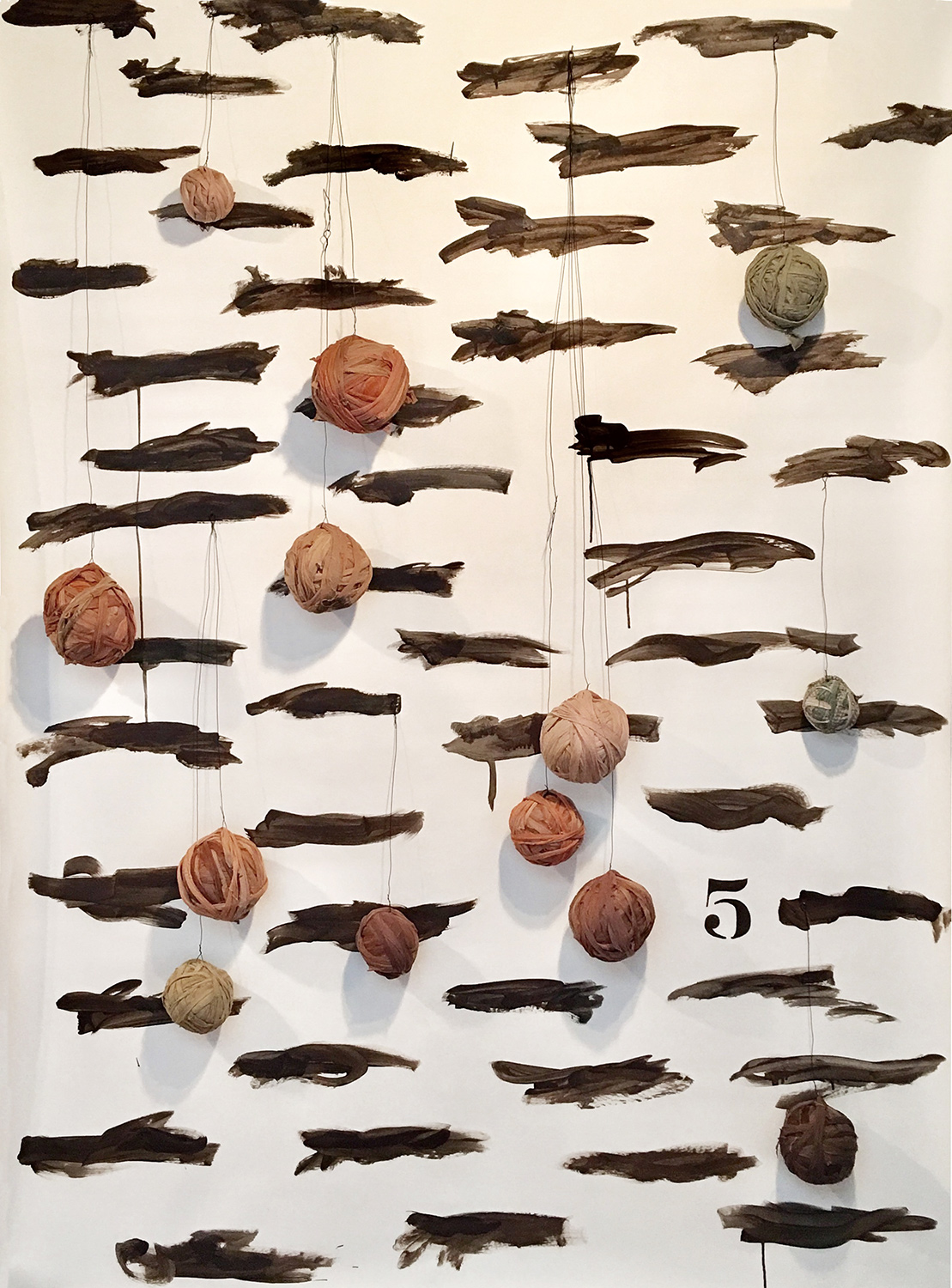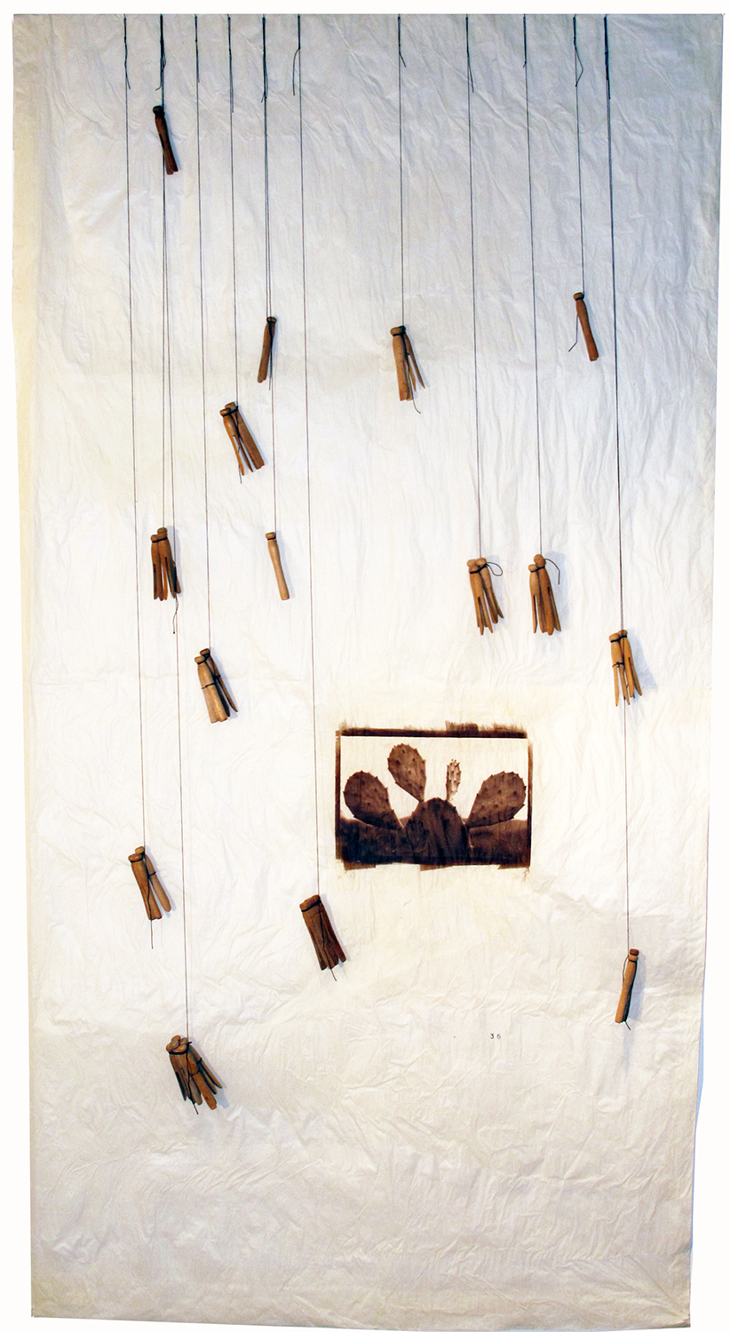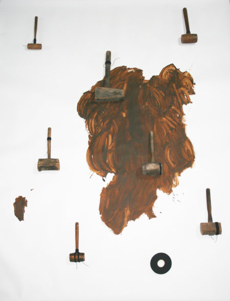 Acrylic on paper, cotton thread, tempera, wooden hammers